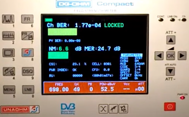 La potenza è l'intensità "bruta" del segnale ricevuto. Si misura in dBµV (Decibel MicroVolt), non in percentuale (come su alcuni modelli)! La potenza è un parametro essenziale per stabilire se il segnale sia adeguato per essere processato dal sintonizzatore.